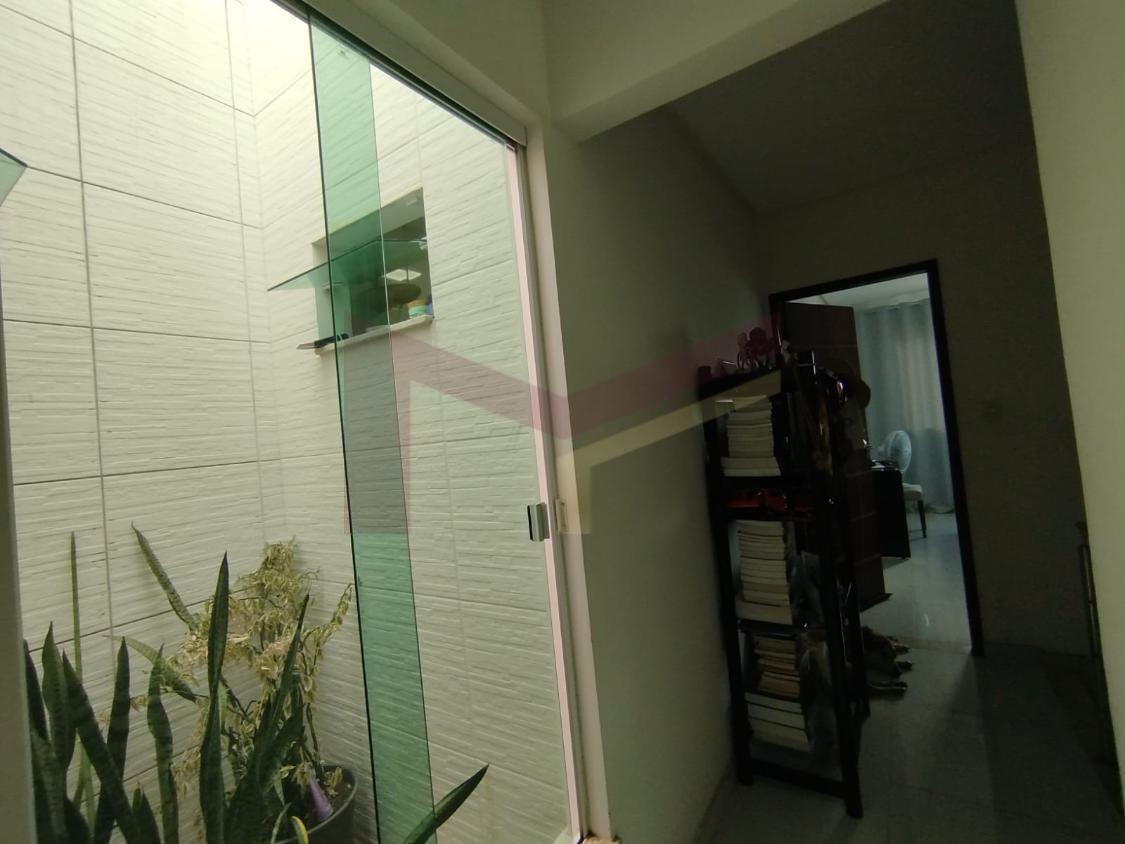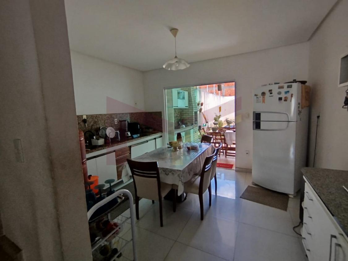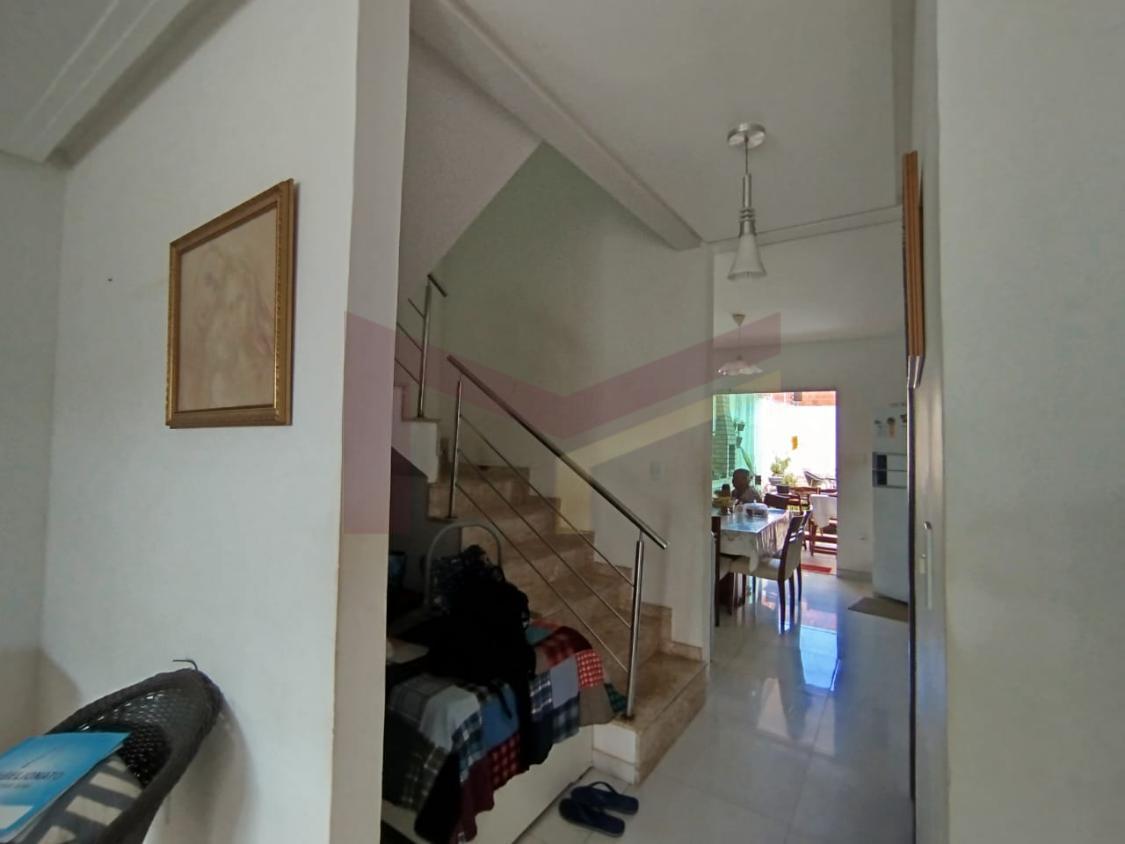 Na parte debaixo, uma garagem para dois carros, uma sala ampla, banheiro social, uma cozinha ampla, uma área de guardar mantimentos, área de serviço, área de churrasco, jardim, piscina e mais outro banheiro externo